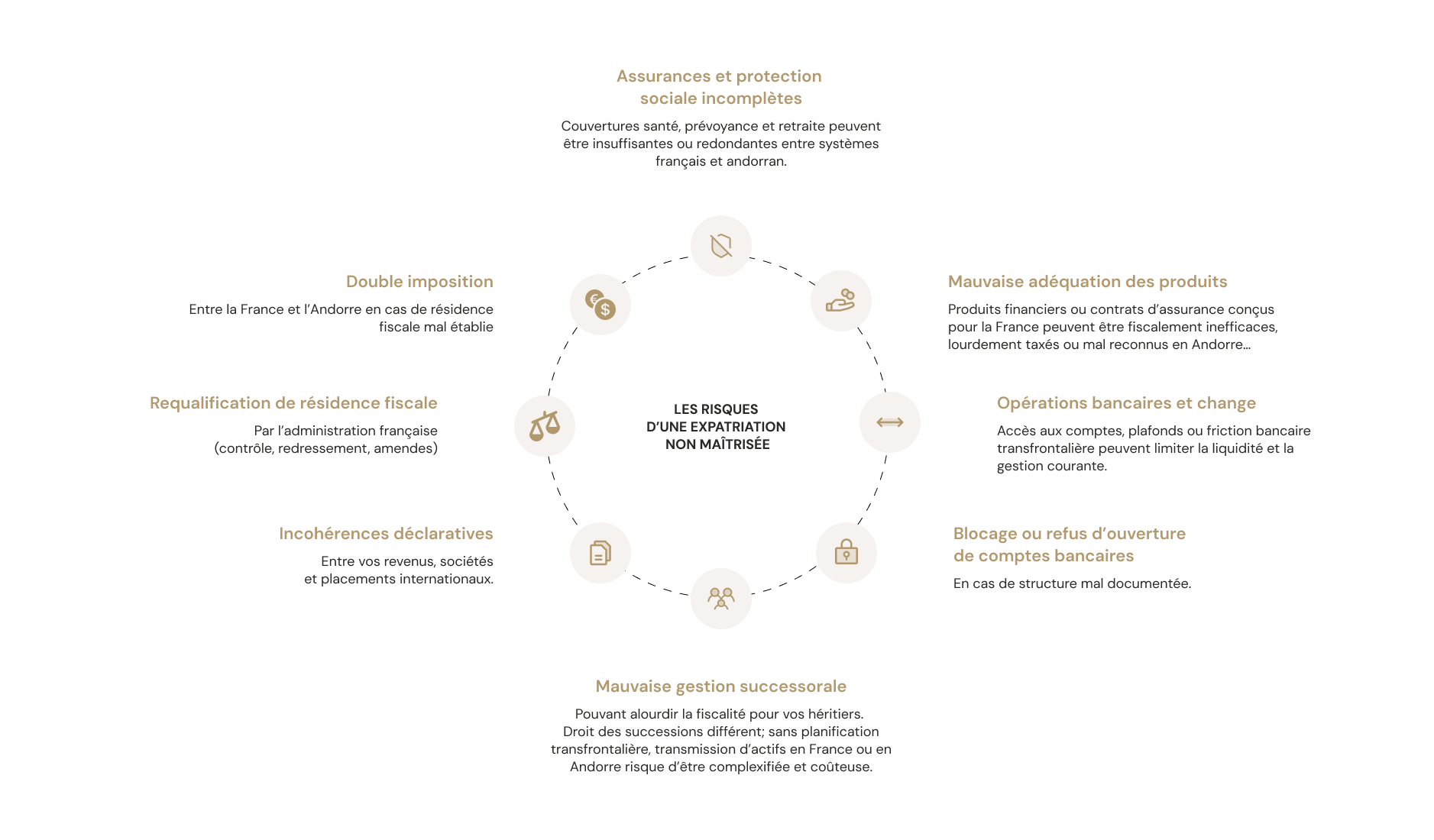 Une expatriation mal préparée peut entraîner des risques fiscaux, juridiques et patrimoniaux majeurs :